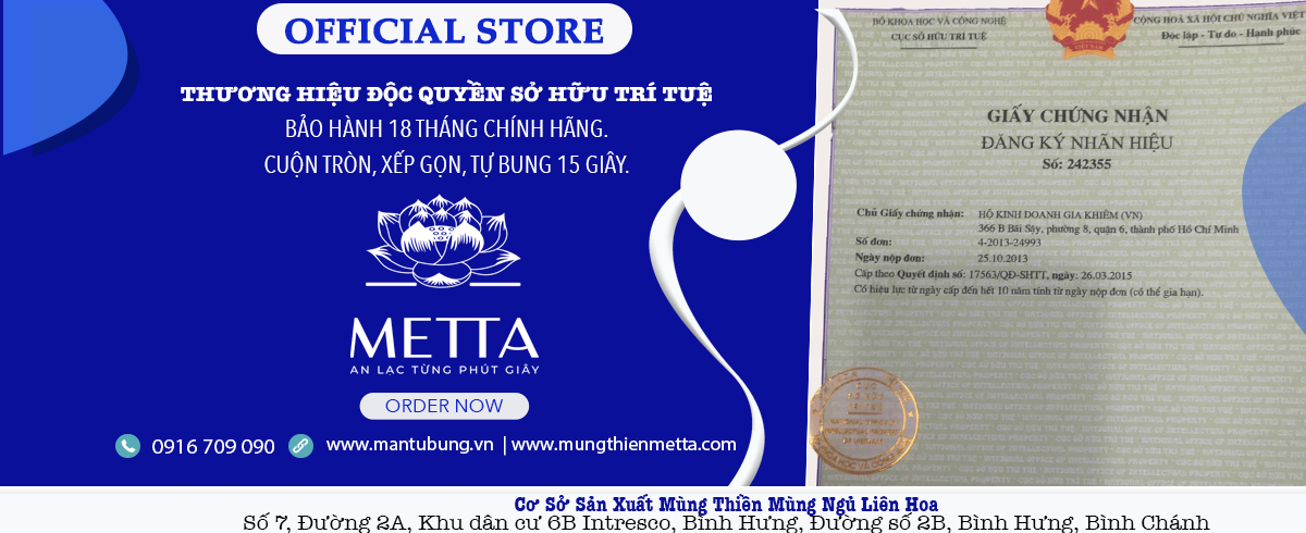 Sản phẩm đăng ký độc quyền. Khuyến cáo khách hàng chú ý hiện nay nhiều cơ sở mùng tự bung thiếu trung thực đã lấy cắp một số hình ảnh mùng Metta đưa lên website của mình chào hàng.